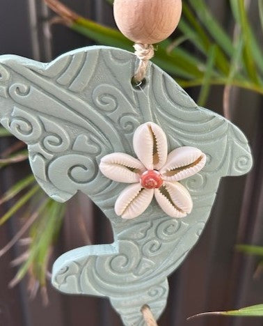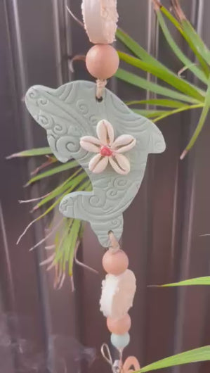 Zhush up your outdoor space with these gorgeous hanging mozzie coils creating a mozzie free space to enjoy. This Dolphin has been hand cut, hand stamped and blended beautifully with Cowrie shell flower, beachwood beads, engraved handmade clay beads with a Shark Bay shell disks. Comes with a steel clip to secure the Mosquito coil.